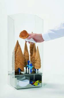 - zur hygienischen Entnahme mit einer Serviette stehen die Eishörnchen mit der Spitze nach oben